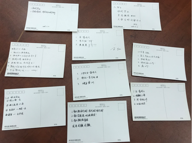 感受到过去祖国的强大,让党员同志们都对未来充满信心,在活动的第二环节,党支部开展了总结过去、直面未来,活动分两部分,一部分是写给未来自己的一封信,这份信带着大家对过去一年的期许,带着对未来的幻想,带着对自我反思,尘封在一个密码盒中,明年元旦之际,将寄到各位手中。第二部分,公开小目标,相互监督,共同进步,大家将小目标写在明信片上,发到QQ群中,相互监督。